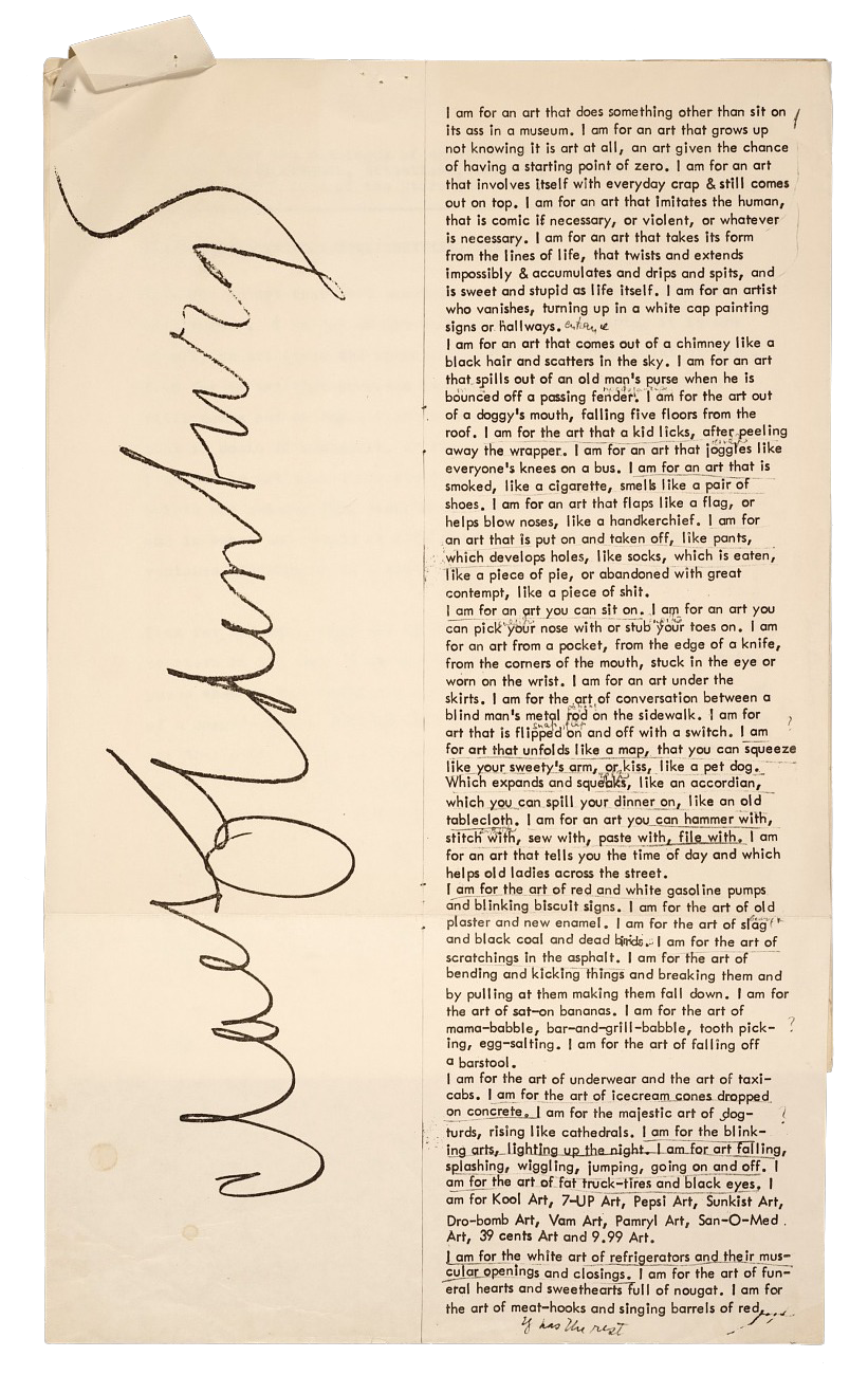 Я за искусство, которое разворачивается, как карта, которое можно сжать, как руку возлюбленного, которое подобно поцелую или собаке. Я за искусство, которое растягивается и скрипит, как старый аккордеон, которое можно разлить, как суп, которое похоже на старую скатерть.